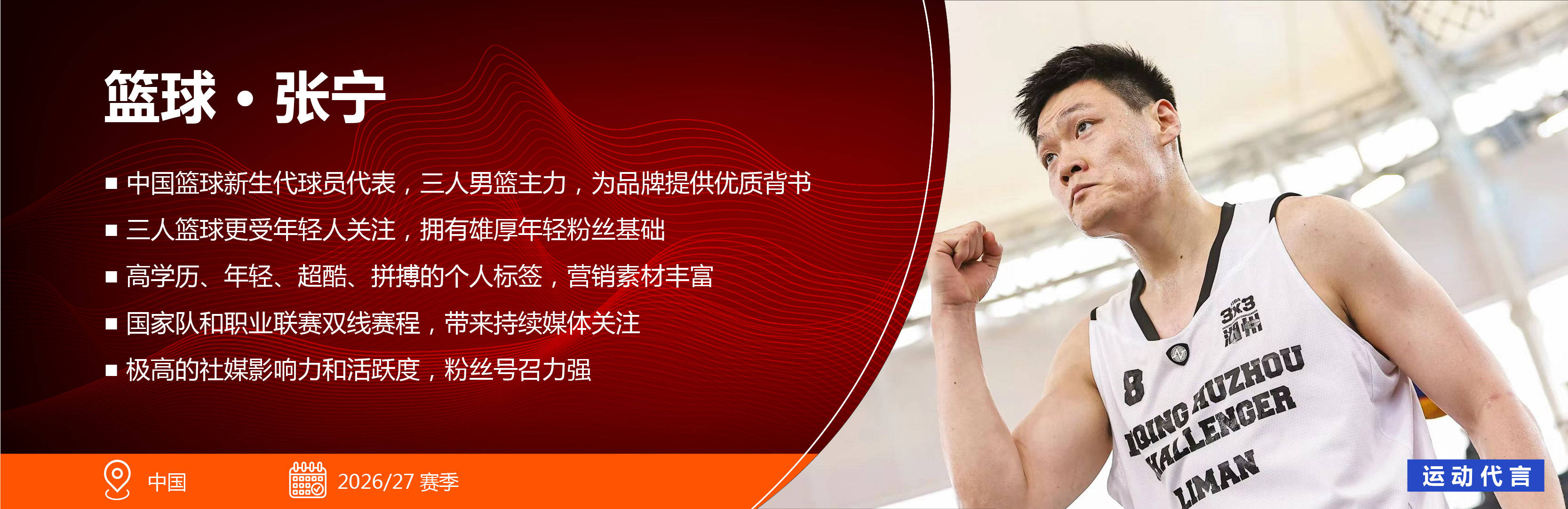 鲜明的个人形象,深入人心的体育故事。张宁是校园篮球的成功代表,这在当下的国内篮球大环境中是尤为难能可贵且具有极强差异化的。另外张宁从校园篮球到职业篮球的发展之路也为很多拥有篮球梦想的人提供了路径模板。从张宁身上,我们能看到梦想和努力的价值以及有血有肉的体育拼搏故事。对于营销品牌而言,这是具有极高价值的软性资产。